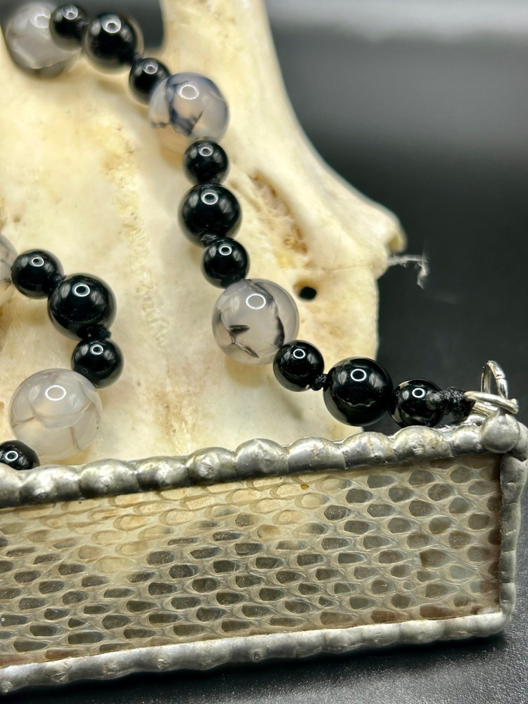 The necklace is made up of black obsidian and black rudilated quartz. It is hand-knotted with intention.