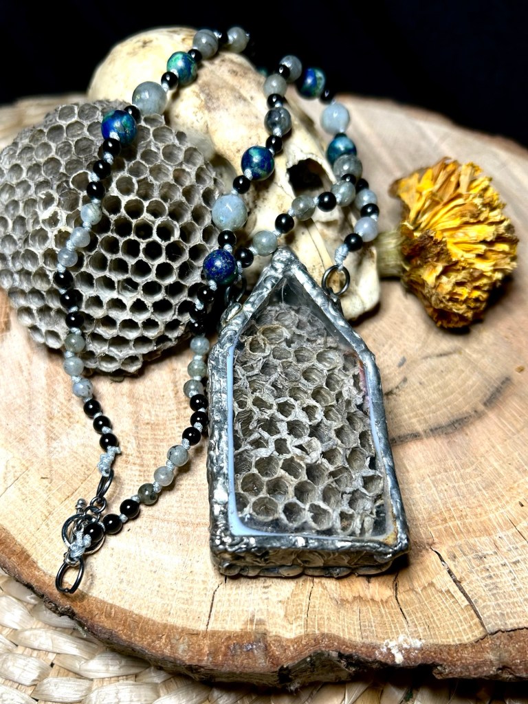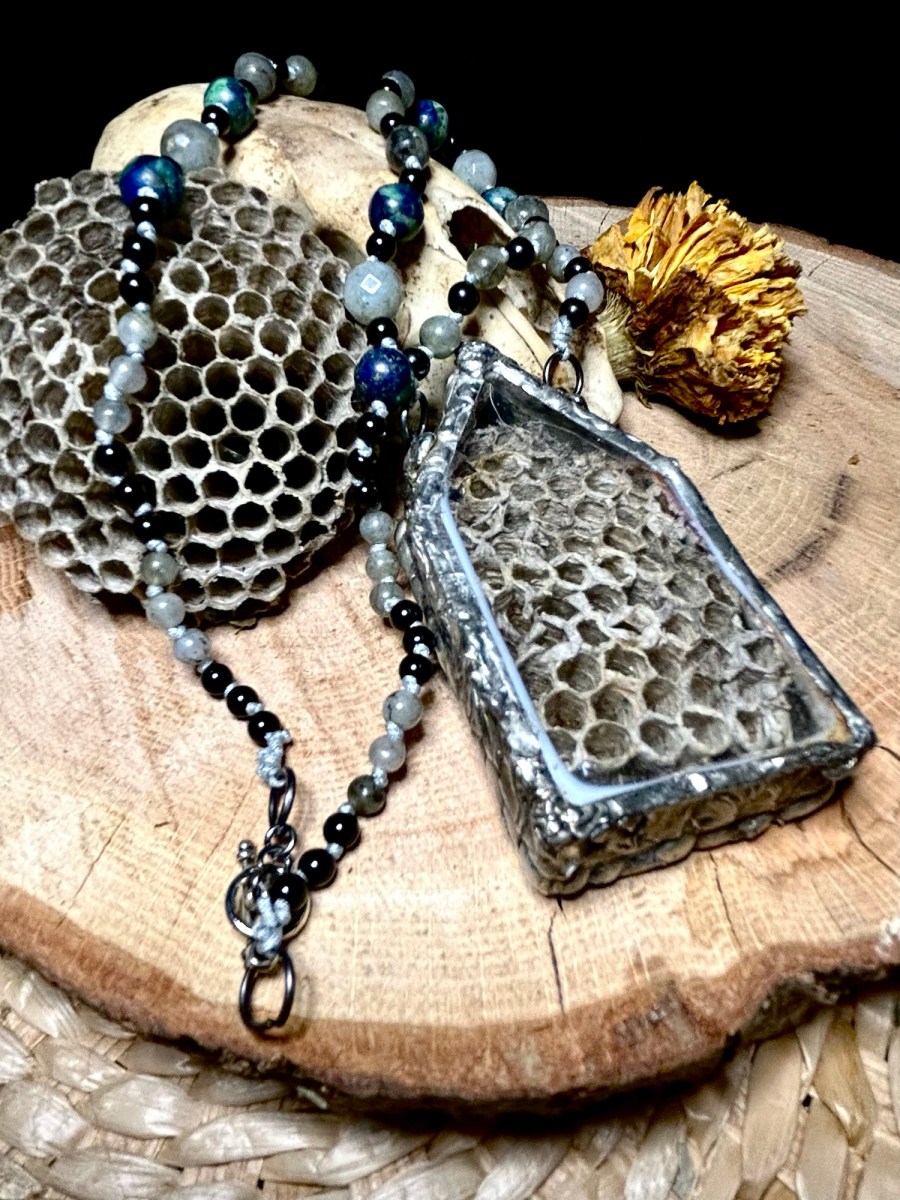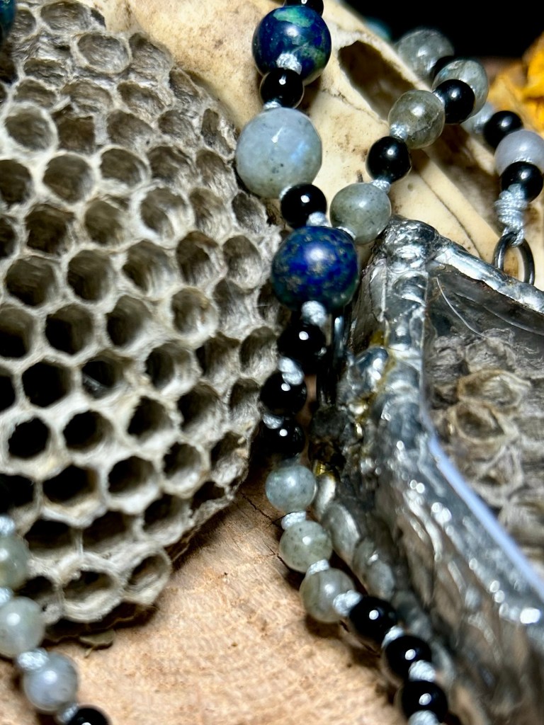 This reliquary is strung with labradorite, obsidian and chrysocolla. I’ve hand knotted the gray cording to separate and protect each bead from wear.