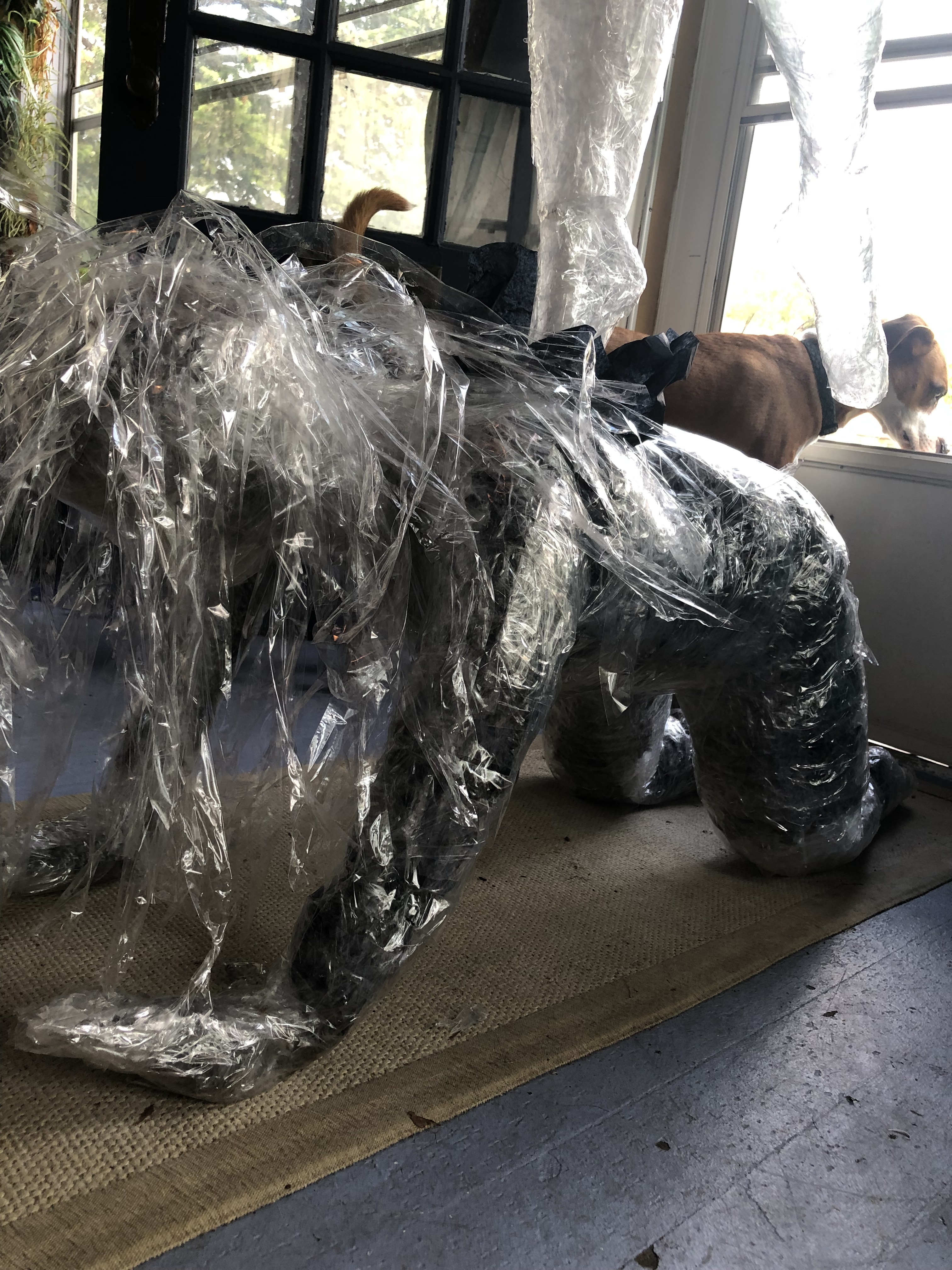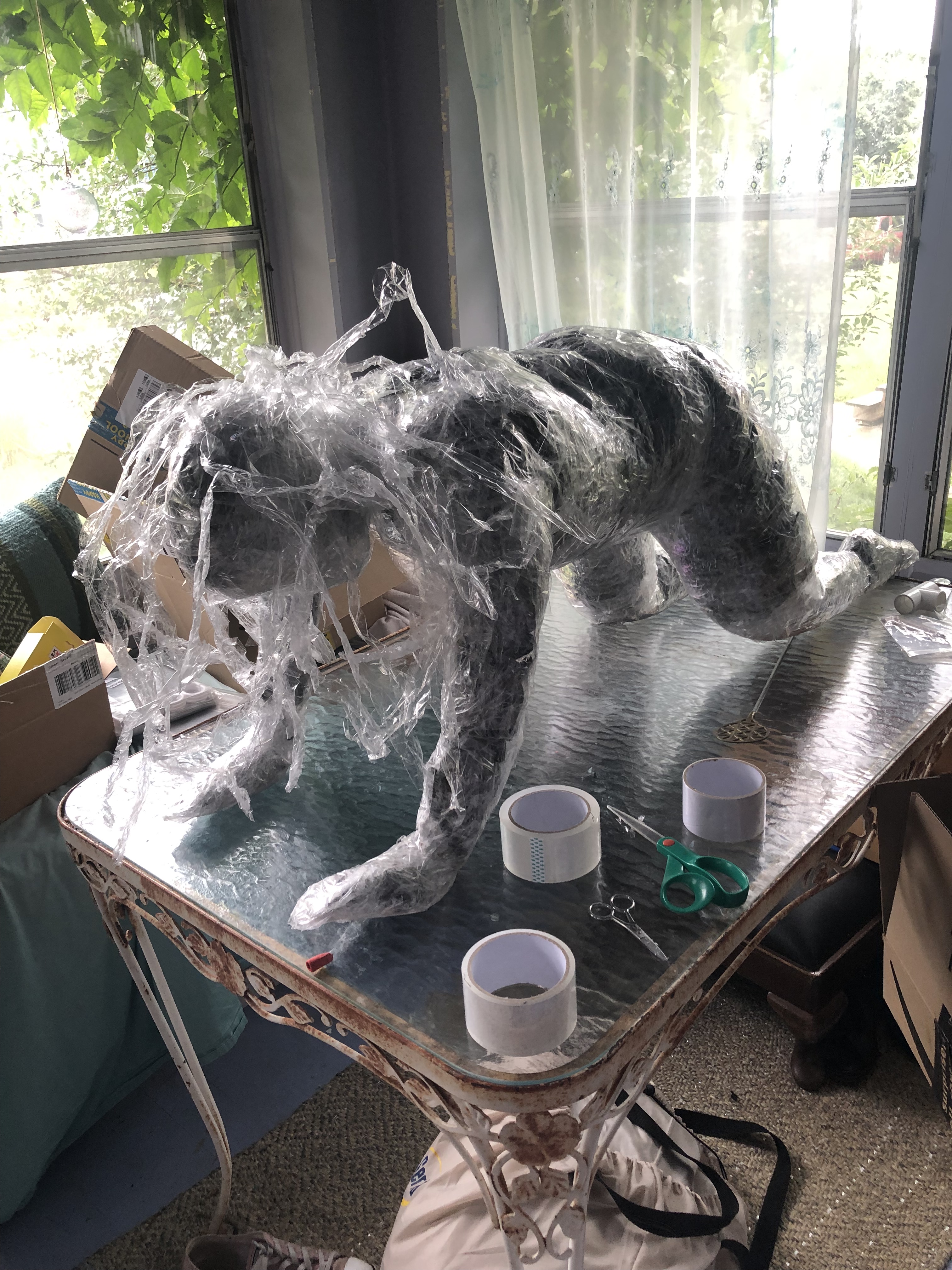 I spent a weekend with my son and his sweetie in Chicago, and she volunteered to be my model for the sculpture. We spent hours together in my son’s apartment, her, wearing barely nothing and me intently covering her torso and limbs with layers of packing tape while my son yelled at the video game he was playing. Luckily he’s used to me doing weird art projects like this. She, on the other hand, couldn’t imagine her mom doing a project like this. My son would occasionally put the remote control down and scratch her itchy nose or find the end of the tape roll for me. A family that creates together sticks together. Once the pieces were all formed and she was freed from them, I carefully packed them up and headed home. Once home, the building started.