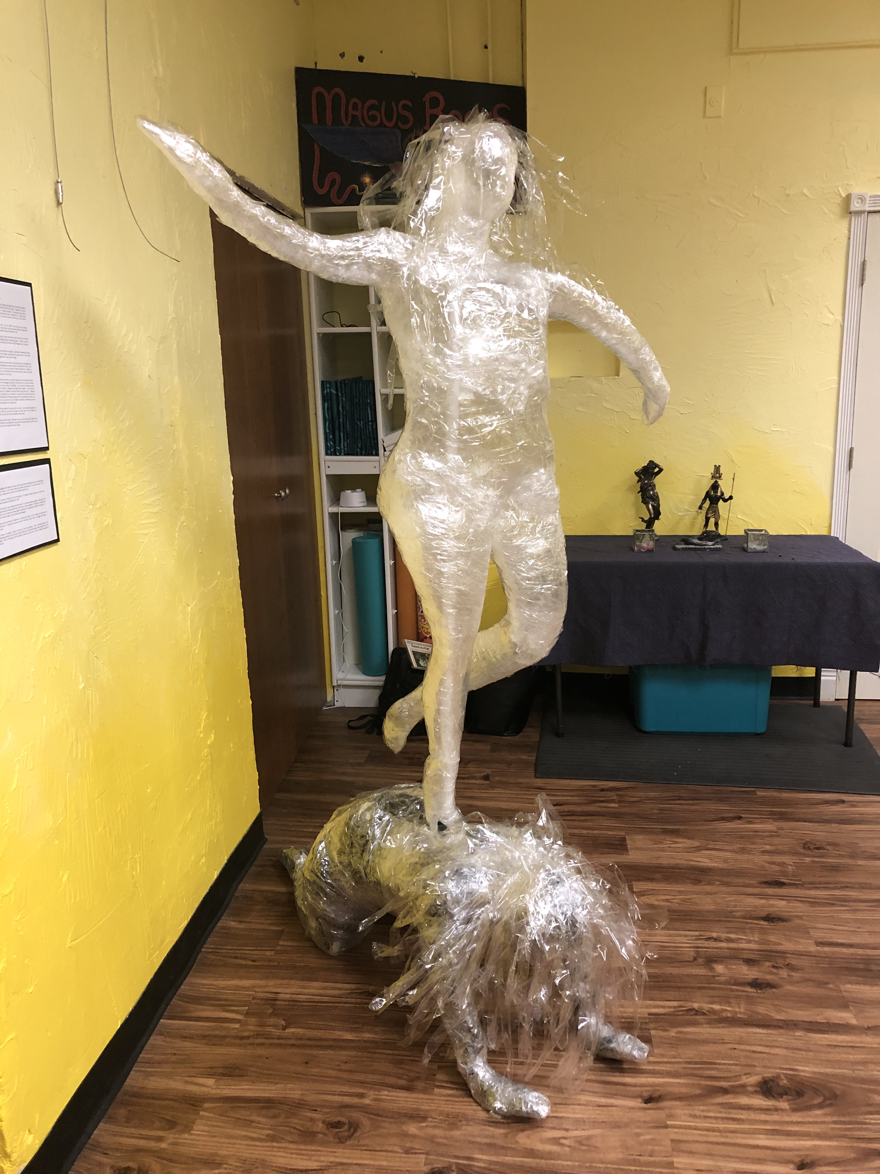 Each layer of tape I placed on her represented another piece of me holding myself together as I rebuilt my life. One arm curved upwards, and the other arched towards the earth like the Baphomet, in an expression of “as above, so below”. It became evident to me that this symbolized Solve et Coagula; to dissolve and to make whole again. Each part of this sculpture had to be separated from the model and reassembled in a different location, symbolizing how I wasn’t the same person at this point in my recovery journey as I was when I began it. Her head was tilted to one side, yet she was gazing upwards. In this gesture she seemed to acknowledge her past as she was looking towards her future. She was balanced on the toes of one foot while the other leg gracefully kicked back behind her. This added to the feeling of weightlessness. She was spinning out of the heavy darkness of her past and rising upwards to the light.