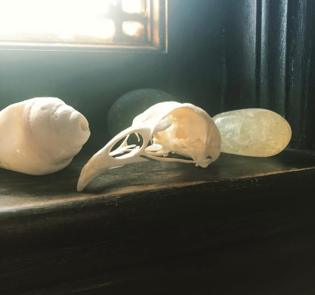 I rarely purchase bones. Most of the bones I have are found in forests or along roadsides, or are given to me as gifts. Of the few bones I’ve purchased, they seem to come into my awareness in special ways, as if they aligned themselves to me. One dog skull I purchased happened to show up while I was looking for jewelry supplies on Ebay. When she appeared in my feed, I felt drawn to her and made the purchase. When she arrived in the mail, her energy literally leapt out of the box as I lifted the skull from the packaging. I instantly saw the image of a small purple flower in my mind’s eye and realized she was telling me her name was Violet. She has a special place in my home and in my heart.
